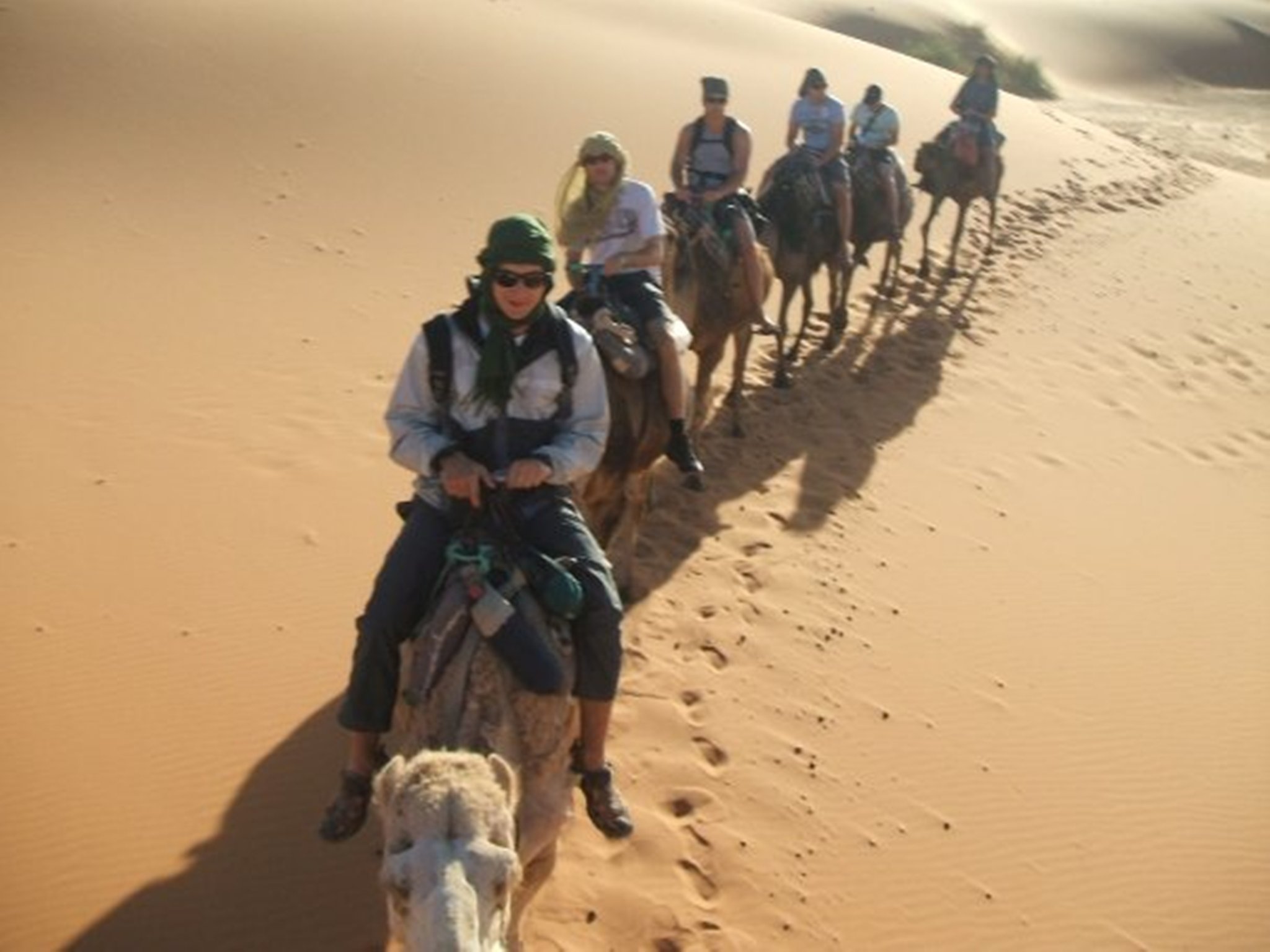 После завтрака в отеле, мы продолжим наше путешествие.Путь пролегает через долину Дадес, окруженную могущественными скалами.Пересекая долину, наслаждайтесь видом старых берберских деревень,практически не тронутых цевилизацией . Прибываем в ущелье Тодра, поражающее высокими красными скалами.Здесь многие альпинисты практикуют любимый вид спорта .Если вы не являетесь любителем скалолазания, можете пойти по пешеходным дорожкам и насладиться фантастическими видами и интересными пейзажами. По дну ущелья проходит ручей с кристально чистой водой .Обед в Эрфуде .Затем направляемся в деревню Мерзуга,где нас встретят чашечкой ароматного мятного чая .На верблюдах,в таинственном море песка ,под руководством опытного гида, отправляемся в пустыню.Там нам предстоит первая ночь под звездами или в кочевой берберской палатке .Ужин и завтрак включен.